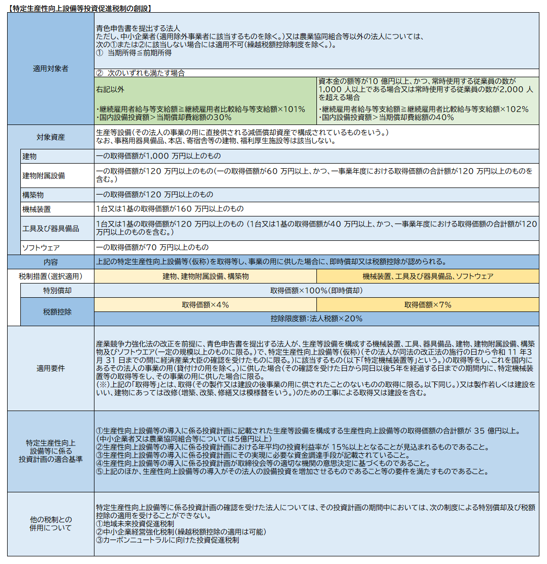 ・特定生産性向上設備等(仮称)(令和11年2月21日までの間に生産性向上等設備の導入に係る投資計画において生産性向上設備等の取得価額の合計額が25億円以上(中小企業者等については、5億円以上)であること及び投資計画における年平均の投資利益率が15%以上となることが見込まれること等の基準に適合することについて経済産業大臣の確認を受けたものに限る。)を、その確認を受けた日から5年を経過する日までの間に取得等した場合、即時償却と税額控除(取得価額の7%(建物、建物附属設備及び構築物については、4%))との選択適用ができます。ただし、税額控除における控除税額は当期の法人税額の20%を上限とし、予見し難い国際経済事情の急激な変化に対応するための計画について認定を受けた場合、控除限度超過額は2年間の繰越しができます。