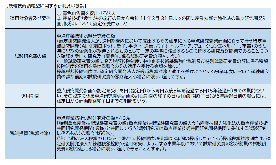 ・「戦略技術領域型」を創設し、AI・量子・バイオ等に係る試験研究費について、その試験研究費の額の40%(産業技術力強化法の重点産業技術共同研究開発機関(仮称)との共同・委託研究については50%)の税額控除ができます。ただし、控除税額は当期の法人税額の10%を上限とし、控除限度超過額は2年間の繰越しができます。