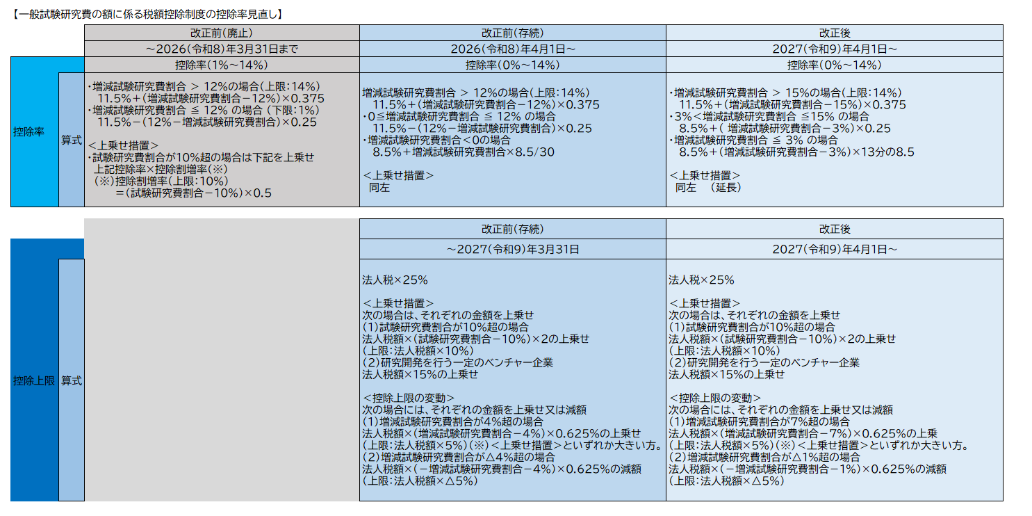 ・一般試験研究費の額に係る税額控除制度について、控除率カーブ及び控除上限の変動措置の見直しが行われました。