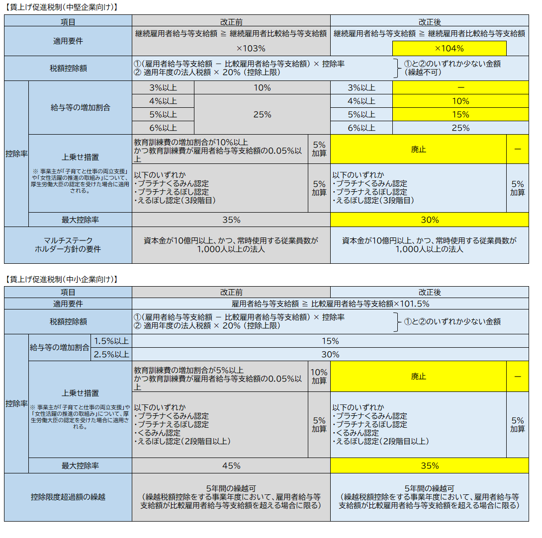 ・大企業向け措置については、令和8年2月21日をもって廃止、中堅企業向け措置については、適用要件・税額控除率の見直しを行った上で、適用期限(令和9年2月21日)をもって廃止される予定です。教育訓練費に係る上乗せ措置については、改正後から廃止されます。